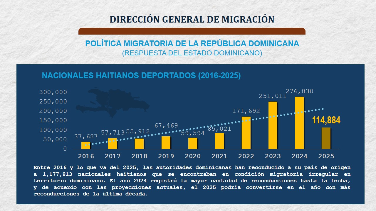 Presentó cifras estadísticas según las cuales la DGM, como respuesta del Estado Dominicano al flujo de indocumentados, desde 2016 hasta la fecha se han deportado 1,177,813 extranjeros en condición migratoria irregular, de los que 114,884 corresponden a este año 2025, mediante acciones ejecutadas dentro del marco legal y en las que prevalece el respeto a los derechos humanos y la dignidad de las personas.